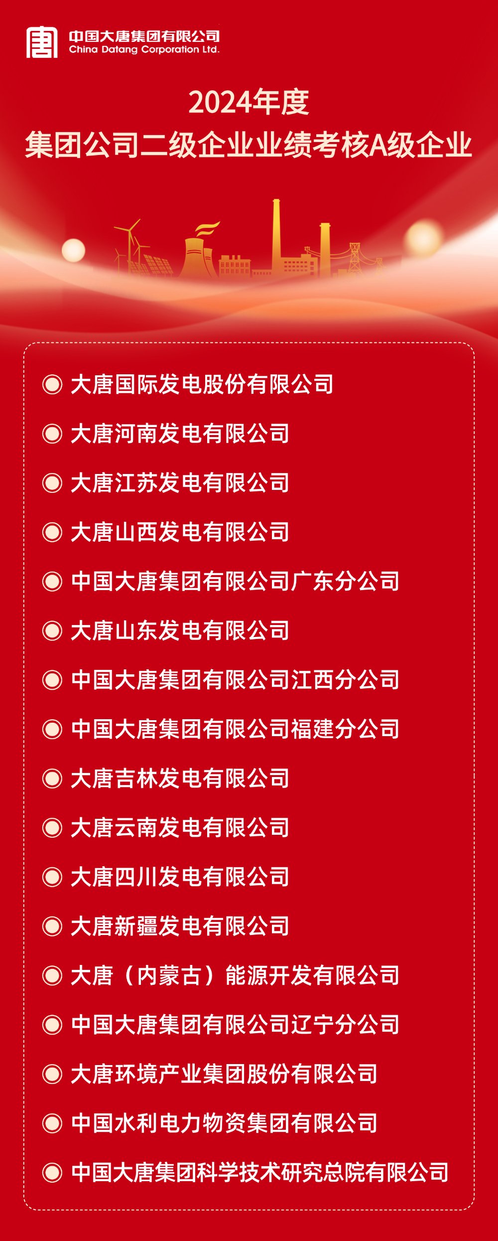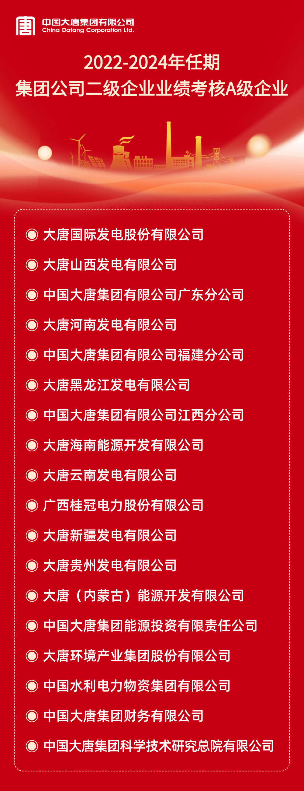 本網(wǎng)訊 根據(jù)《中國大唐集團有限公司所屬企業(yè)年度業(yè)績考核辦法》和《中國大唐集團有限公司所屬企業(yè)任期業(yè)績考核管理辦法(試行)》及有關規(guī)定,2024年度及2022-2024年任期二級企業(yè)業(yè)績考核結(jié)果已經(jīng)集團公司董事長專題會審議通過。A級企業(yè)名單如下: